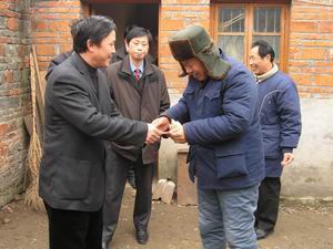 为使全场职工特别是困难职工家庭都能过一个安定 祥和的春节,潘村湖农场于近日开展了向困难职工家 庭"送温暖"活动.场领导韩大鸣、林贤传、陶卫东、 殷文格率领有关部门的同志组成三个慰问组,携带 慰问金和慰问品登门看望困难职工家庭,为他们送 去了组织上的温暖。图为韩大鸣场长(左一)亲手 将慰问金送到因患重病而生活困难的七分场退休职 工尹成华手中的情景。(杨登宏摄)