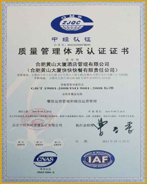 近日,安徽农垦黄山大厦KK快餐有限公司顺利通过了由北京中经科环质量认证有限公司组织的ISO90012008质量管理体系认证评审,并获得了认证证书。